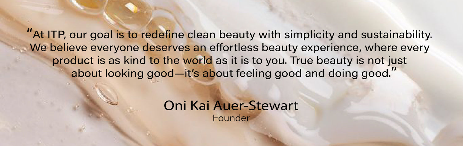 After a notable fashion career, Oni shifted towards sustainability, recognizing the fashion industry's harmful environmental impact. After an extensive rabbit hole of sustainable chemical research she was led to skincare, a long-time passion. Discovering differences in skincare regulations between the US and Europe, she meticulously researched ingredients in her SPF and skincare products, discarding harmful ones. This marked the realization of her childhood dream - creating beauty while doing good. Thus, ITP was born, offering products that are good for you and good for the world.